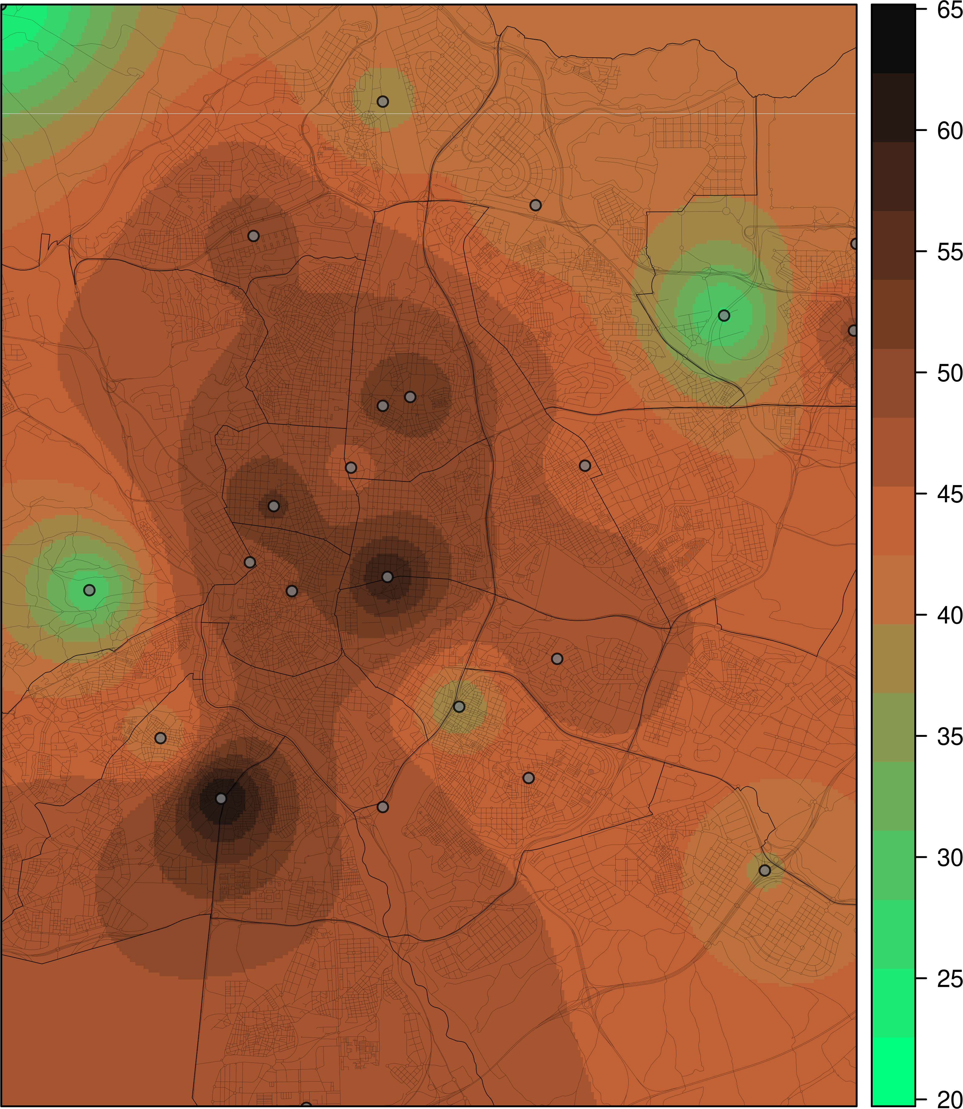 ################################################################## ## Initial configuration ################################################################## ## Clone or download the repository and set the working directory ## with setwd to the folder where the repository is located. library("lattice") library("ggplot2") ## latticeExtra must be loaded after ggplot2 to prevent masking of its ## `layer` function. library("latticeExtra") library("RColorBrewer") source("configLattice.R") ################################################################## library("sp") library("sf") NO2sf <- st_read(dsn = "data/Spatial/", layer = "NO2sf") airPal <- colorRampPalette(c("springgreen1", "sienna3", "gray5"))(5) ################################################################## ## Proportional symbol: ggplot ################################################################## ## Create a categorical variable NO2sf$Mean <- cut(NO2sf$mean, 5) ggplot(data = NO2sf) + geom_sf(aes(size = Mean, fill = Mean), pch = 21, col = 'black') + scale_fill_manual(values = airPal) + theme_bw() ################################################################## ## Proportional symbol: sppplot ################################################################## NO2sp <- as(NO2sf, "Spatial") spplot(NO2sp["mean"], col.regions = airPal, ## Palette cex = sqrt(1:5), ## Size of circles edge.col = "black", ## Color of border scales = list(draw = TRUE), ## Draw scales key.space = "right") ## Put legend on the right ################################################################## ## Optimal classification and sizes to improve discrimination ################################################################## library("classInt") ## The number of classes is chosen between the Sturges and the ## Scott rules. nClasses <- 5 intervals <- classIntervals(NO2sp$mean, n = nClasses, style = "fisher") ## Number of classes is not always the same as the proposed number nClasses <- length(intervals$brks) - 1 op <- options(digits = 4) tab <- print(intervals) options(op) ## Complete Dent set of circle radii (mm) dent <- c(0.64, 1.14, 1.65, 2.79, 4.32, 6.22, 9.65, 12.95, 15.11) ## Subset for our dataset dentAQ <- dent[seq_len(nClasses)] ## Link Size and Class: findCols returns the class number of each ## point; cex is the vector of sizes for each data point idx <- findCols(intervals) cexNO2 <- dentAQ[idx] ## spplot version NO2sp$classNO2 <- factor(names(tab)[idx]) ## Definition of an improved key with title and background NO2key <- list(x = 0.99, y = 0.01, corner = c(1, 0), title = expression(NO[2]~~(paste(mu, plain(g))/m^3)), cex.title = 0.8, cex = 1, background = "gray92") pNO2 <- spplot(NO2sp["classNO2"], col.regions = airPal, cex = dentAQ * 0.8, edge.col = "black", scales = list(draw = TRUE), key.space = NO2key) pNO2 ## ggplot2 version NO2sf$classNO2 <- factor(names(tab)[idx]) ggplot(data = NO2sf) + geom_sf(aes(size = classNO2, fill = classNO2), pch = 21, col = "black") + scale_fill_manual(values = airPal) + scale_size_manual(values = dentAQ * 2) + xlab("") + ylab("") + theme_bw() ################################################################## ## Spatial context with underlying layers and labels ################################################################## ################################################################## ## OpenStreetMap ################################################################## library("osmdata") madridBox <- st_bbox(NO2sf) qosm <- opq(madridBox) %>% add_osm_feature(key = "highway", value = "residential") qsf <- osmdata_sf(qosm) library("ggrepel") ggplot()+ ## Layers are drawn sequentially, so the NO2sf layer must be in ## the last place to be on top geom_sf(data = qsf$osm_lines["name"], size = 0.3, color = "lightgray") + geom_sf(data = NO2sf, aes(size = classNO2, fill = classNO2), pch = 21, col = "black") + ## Labels for each point, with position according to the circle size ## and the rest of labels geom_text_repel(data = NO2sf, aes(label = substring(codEst, 7), geometry = geometry, point.size = classNO2), stat = "sf_coordinates") + scale_fill_manual(values = airPal) + scale_size_manual(values = dentAQ * 2) + labs(x = NULL, y = NULL) + theme_bw() qsp <- osmdata_sp(qosm) qspLines <- list("sp.lines", qsp$osm_lines["name"], lwd = 0.1) spplot(NO2sp["classNO2"], col.regions = airPal, cex = dentAQ, edge.col = "black", alpha = 0.8, sp.layout = qspLines, scales = list(draw = TRUE), key.space = NO2key) ################################################################## ## Shapefiles ################################################################## ## Madrid districts unzip("data/Spatial/distr2022.zip", exdir = tempdir()) distritosMadridSF <- st_read(dsn = tempdir(), layer = "dist2022") ## Filter the streets of the Municipality of Madrid distritosMadridSF <- distritosMadridSF[distritosMadridSF$CMUN == "079",] ## Assign the geographical reference distritosMadridSF <- st_transform(distritosMadridSF, crs = "WGS84") ## Madrid streets unzip("data/Spatial/call2022.zip", exdir = tempdir()) streetsMadridSF <- st_read(dsn = tempdir(), layer = "Gdie_g_calles") streetsMadridSF <- streetsMadridSF[streetsMadridSF$CDMUNI == "079",] streetsMadridSF <- st_transform(streetsMadridSF, crs = "WGS84") ggplot()+ geom_sf(data = streetsMadridSF, size = 0.1, color = "darkgray") + geom_sf(data = distritosMadridSF, fill = "lightgray", alpha = 0.2, size = 0.15, color = "black") + geom_sf(data = NO2sf, aes(size = classNO2, fill = classNO2), pch = 21, col = "black") + geom_text_repel(data = NO2sf, aes(label = substring(codEst, 7), geometry = geometry, point.size = classNO2), size = 2.5, stat = "sf_coordinates") + scale_fill_manual(values = airPal) + scale_size_manual(values = dentAQ * 2) + labs(x = NULL, y = NULL) + theme_bw() distritosMadridSP <- as(distritosMadridSF, "Spatial") streetsMadridSP <- as(streetsMadridSF, "Spatial") ## Lists using the structure accepted by sp.layout, with the polygons, ## lines, and points, and their graphical parameter