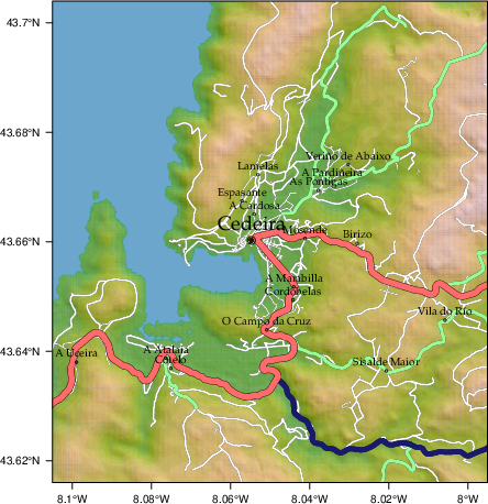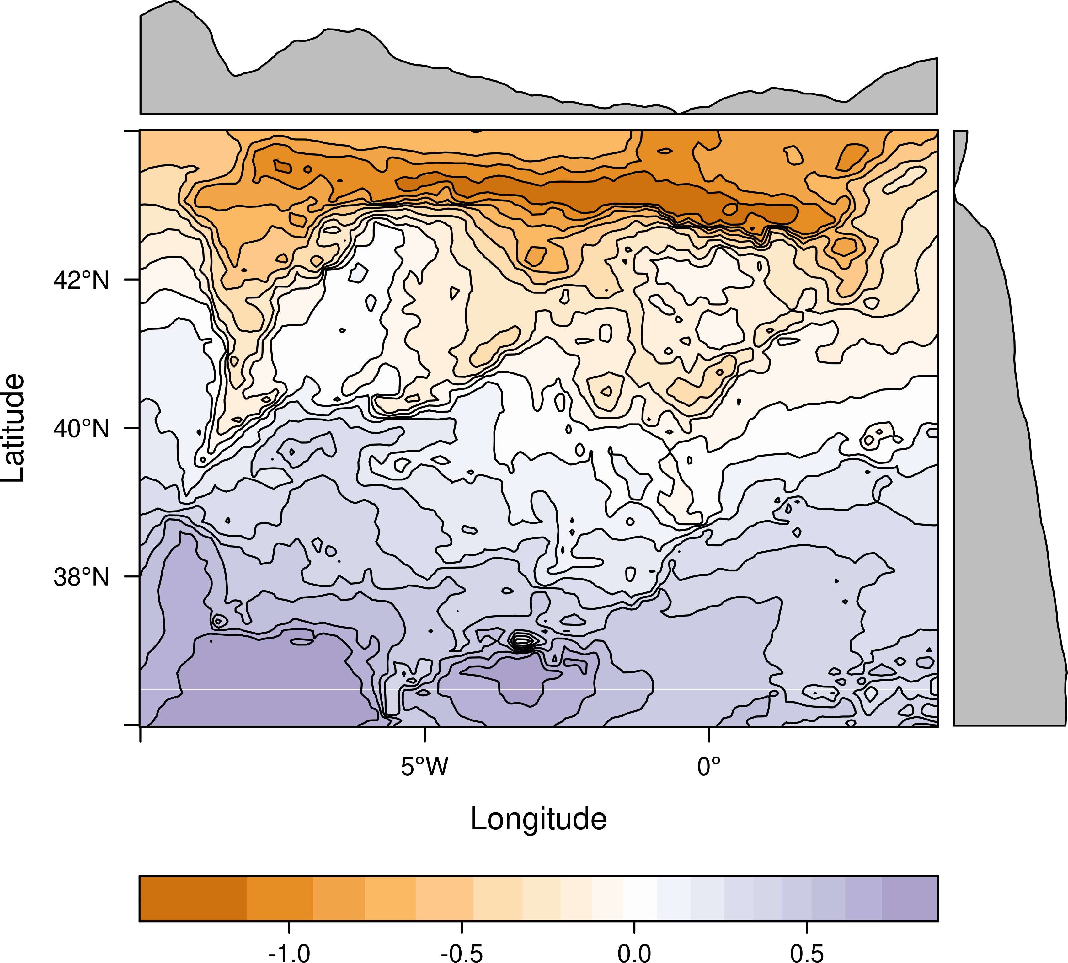 ################################################################## ## Initial configuration ################################################################## ## Clone or download the repository and set the working directory ## with setwd to the folder where the repository is located. library("raster") library("rasterVis") library("RColorBrewer") ## Local vector direction wDir <- raster('data/Spatial/wDir')/180*pi ## Local vector magnitude wSpeed <- raster('data/Spatial/wSpeed') ## Vector field encoded in a RasterStack with two layers, magnitude ## and direction windField <- stack(wSpeed, wDir) names(windField) <- c('magnitude', 'direction') ################################################################## ## Arrow plot ################################################################## vectorTheme <- BTCTheme(regions = list(alpha = 0.7)) vectorplot(windField, isField = TRUE, ##RasterStack is a vector field aspX = 5, aspY = 5, ##Multipliers to adjust the relation ##between slope/aspect and ##horizontal/vertical displacements in ##the figure. scaleSlope = FALSE, ## Slope values are *not* scaled par.settings = vectorTheme, colorkey = FALSE, scales = list(draw = FALSE)) ################################################################## ## Streamlines ################################################################## myTheme <- streamTheme( region = rev(brewer.pal(n = 4, "Greys")), symbol = rev(brewer.pal(n = 9, "Blues"))) streamplot(windField, isField = TRUE, par.settings = myTheme, droplet = list(pc = 12), ## Amount of droplets, percentage of cells streamlet = list(L = 5, ## Length of the streamlet h = 5), ## Calculation step scales = list(draw = FALSE), panel = panel.levelplot.raster)