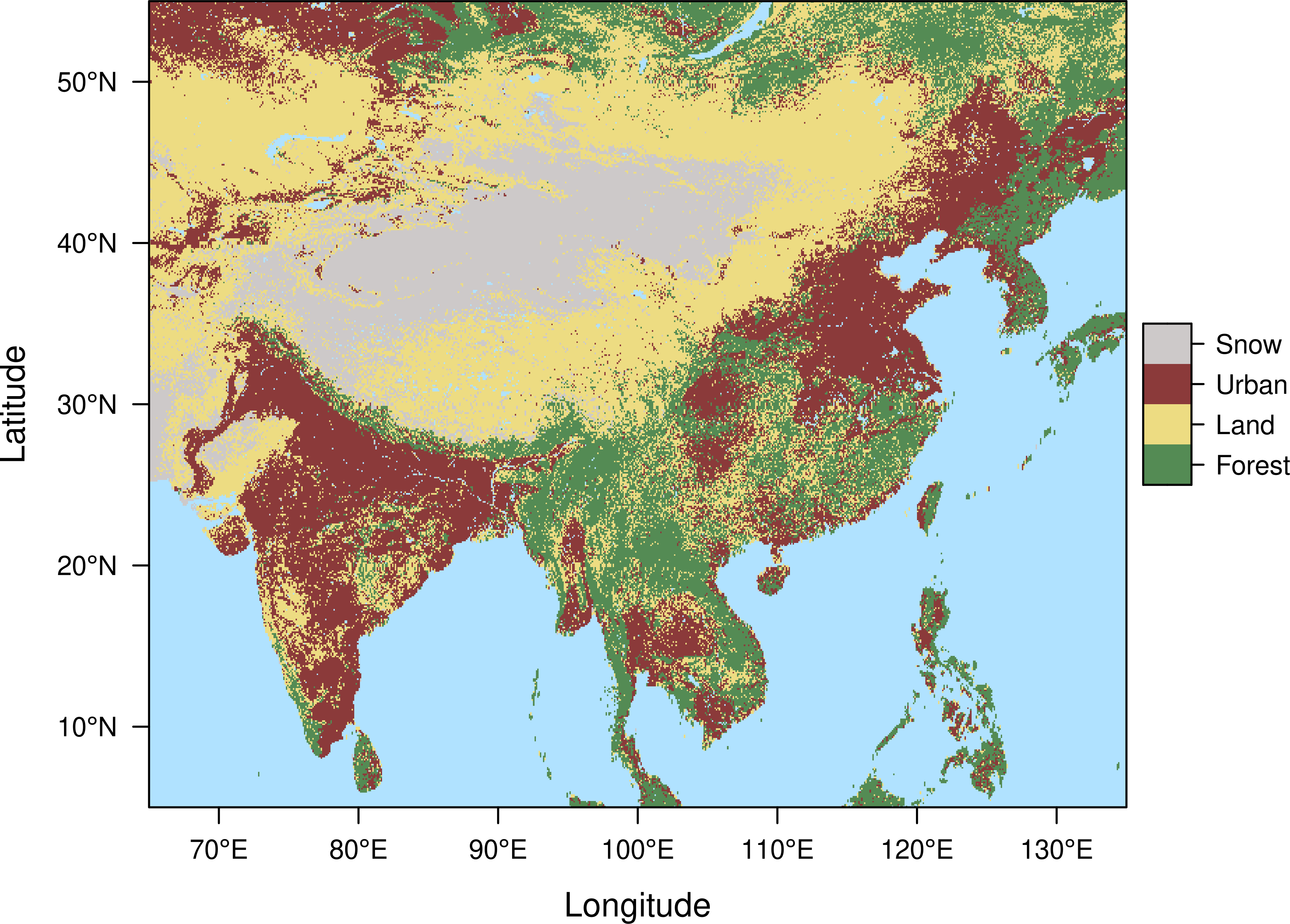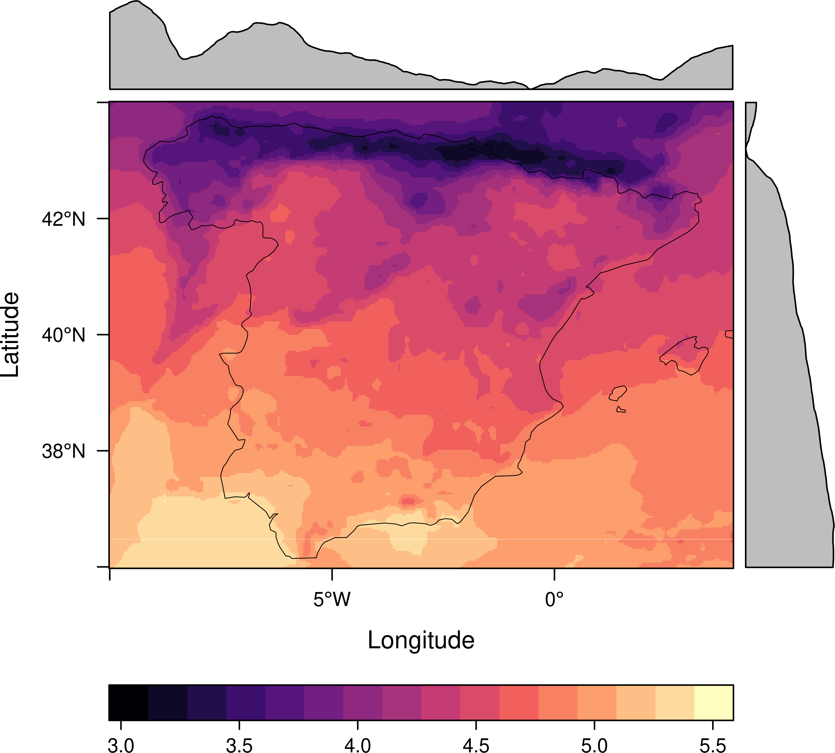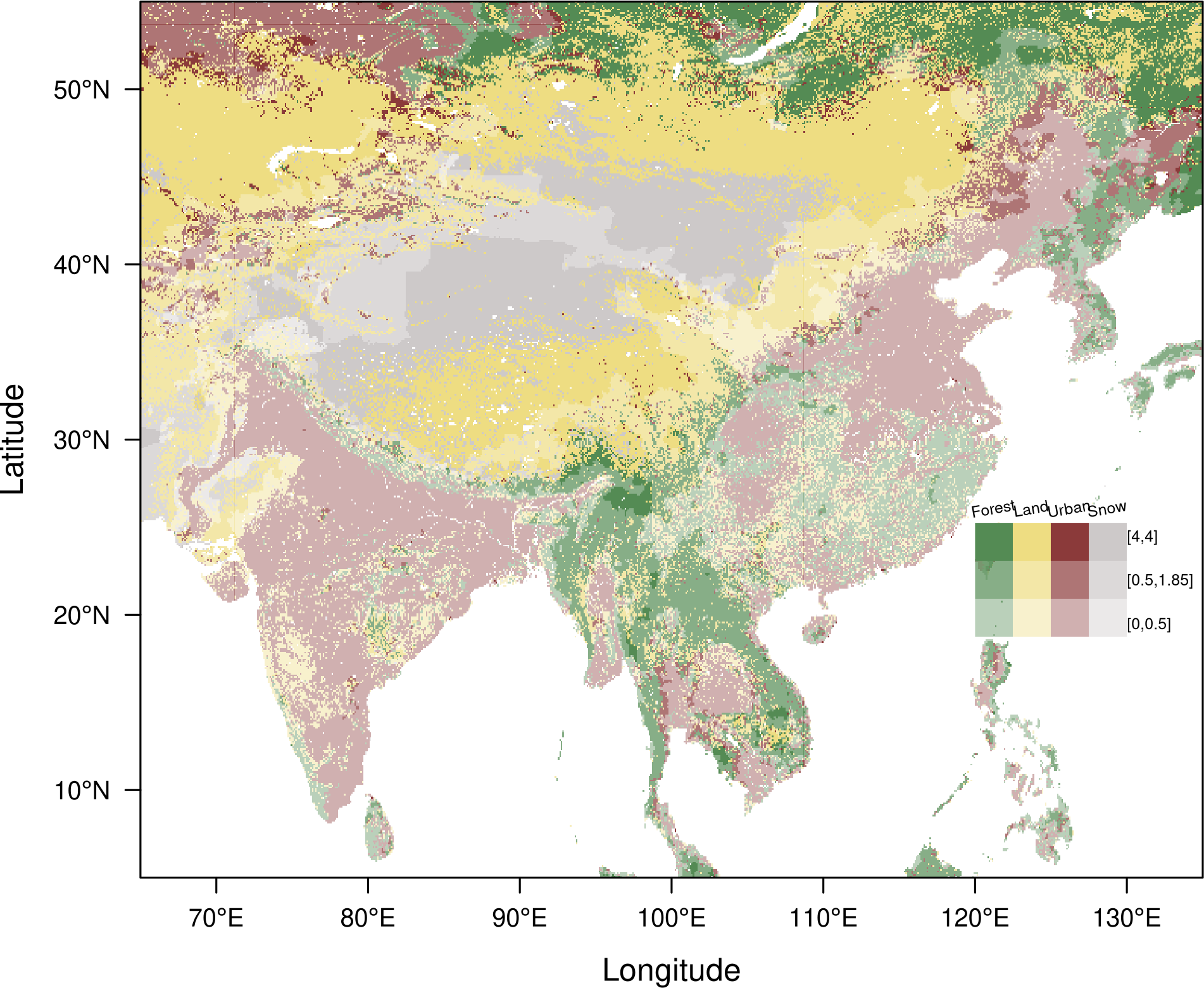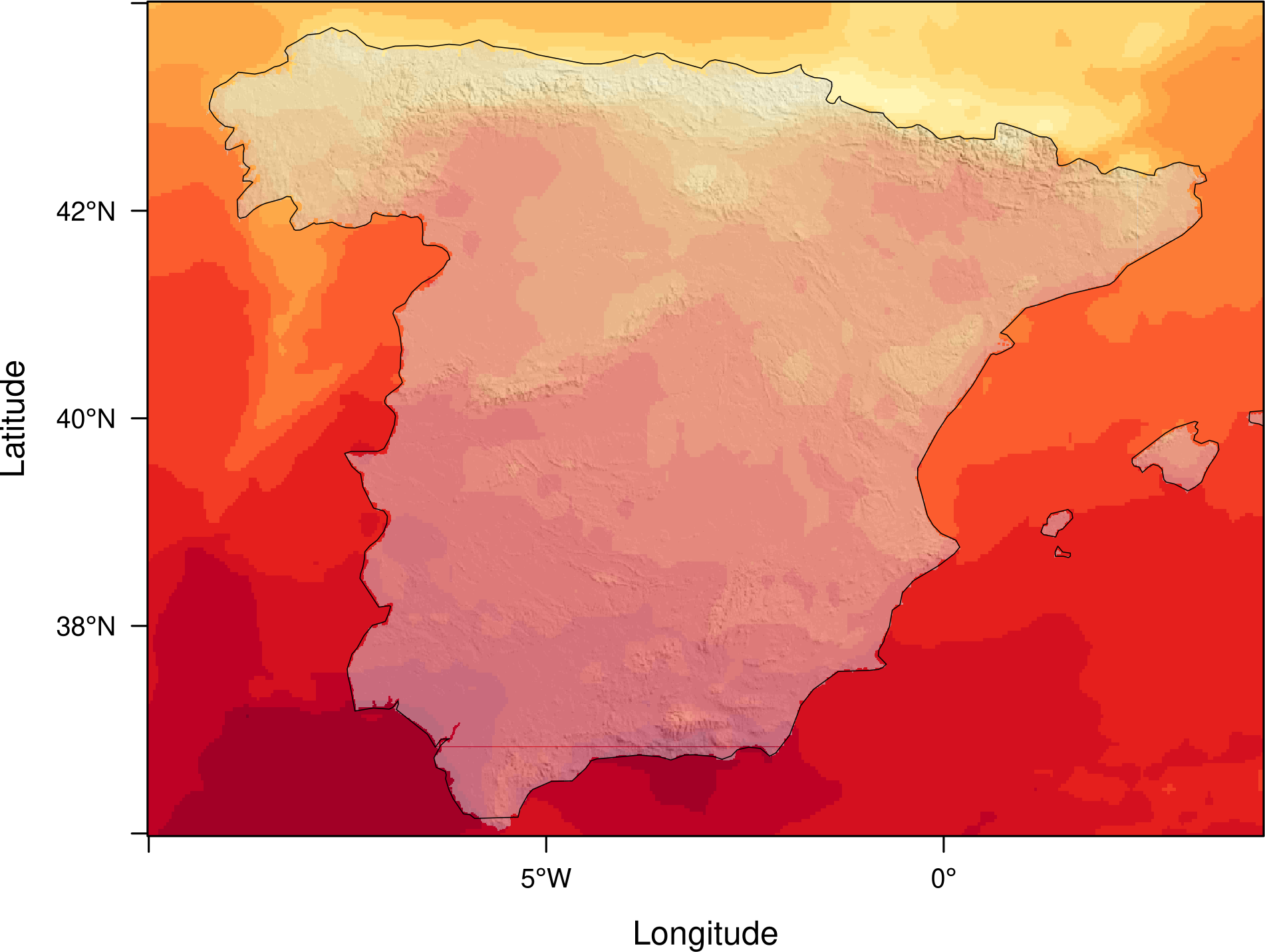 ################################################################## ## Initial configuration ################################################################## ## Clone or download the repository and set the working directory ## with setwd to the folder where the repository is located. library("lattice") library("ggplot2") ## latticeExtra must be loaded after ggplot2 to prevent masking of its ## `layer` function. library("latticeExtra") library("RColorBrewer") source("configLattice.R") ################################################################## ## Quantitative data ################################################################## library("raster") library("terra") library("sf") library("rnaturalearth") library("geodata") library("viridisLite") library("rasterVis") SISavr <- raster("data/Spatial/SISav.nc") SISavt <- rast("data/Spatial/SISav.nc") levelplot(SISavr) boundarySF <- ne_countries(country = "spain", scale = 50) ## Crop to the limits of the raster object boundarySF <- st_crop(boundarySF, xmin = xmin(SISavt), ymin = ymin(SISavt), xmax = xmax(SISavt), ymax = ymax(SISavt)) ##ggplot2 version gplot(SISavt) + geom_sf(data = boundarySF, fill = "transparent") ## lattice version ## Convert the sf object to sp boundarySP <- as(boundarySF, "Spatial") ## Display the data ... levelplot(SISavt) + ## ... and overlay the SpatialLines object layer(sp.lines(boundarySP, lwd = 0.5)) ################################################################## ## Hill shading ################################################################## DEM <- elevation_30s("ESP", path = tempdir()) slope <- terrain(DEM, "slope", unit = "radians") aspect <- terrain(DEM, "aspect", unit = "radians") hs <- shade(slope = slope, aspect = aspect, angle = 60, direction = 45) DEMr <- raster(DEM) sloper <- terrain(DEMr, "slope") aspectr <- terrain(DEMr, "aspect") hsr <- hillShade(slope = sloper, aspect = aspectr, angle = 60, direction = 45) ## hillShade theme: gray colors and semitransparency hsTheme <- GrTheme(regions = list(alpha = 0.5)) levelplot(SISavt, par.settings = YlOrRdTheme, margin = FALSE, colorkey = FALSE) + ## Overlay the hill shade raster levelplot(hs, par.settings = hsTheme, maxpixels = 1e6) + ## and the countries boundaries layer(sp.lines(boundarySP, lwd = 0.5)) ################################################################## ## Diverging palettes ################################################################## meanRad <- global(SISavt, "mean") meanRad <- as.numeric(meanRad) SISavt <- SISavt - meanRad meanRad <- cellStats(SISavr, "mean") SISavr <- SISavr - meanRad xyplot(layer ~ y, data = SISavt, groups = cut(x, 5), par.settings = rasterTheme(symbol = magma(n = 5, begin = 0, end = 0.9, direction = -1)), xlab = "Latitude", ylab = "Solar radiation (scaled)", auto.key = list(space = "right", title = "Longitude", cex.title = 1.3)) divPal <- brewer.pal(n = 9, "PuOr") divPal[5] <- "#FFFFFF" showPal <- function(pal) { N <- length(pal) image(1:N, 1, as.matrix(1:N), col = pal, xlab = "", ylab = "", xaxt = "n", yaxt = "n", bty = "n") } showPal(divPal) divTheme <- rasterTheme(region = divPal) levelplot(SISavt, contour = TRUE, par.settings = divTheme) rng <- range(SISavt[]) ## Number of desired intervals nInt <- 15 ## Increment corresponding to the range and nInt inc0 <- diff(rng)/nInt ## Number of intervals from the negative extreme to zero n0 <- floor(abs(rng[1])/inc0) ## Update the increment adding 1/2 to position zero in the center of an interval inc <- abs(rng[1])/(n0 + 1/2) ## Number of intervals from zero to the positive extreme n1 <- ceiling((rng[2]/inc - 1/2) + 1) ## Collection of breaks breaks <- seq(rng[1], by = inc, length= n0 + 1 + n1) ## Midpoints computed with the median of each interval idx <- findInterval(SISavt[], breaks, rightmost.closed = TRUE) mids <- tapply(SISavt[], idx, median) ## Maximum of the absolute value both limits mx <- max(abs(breaks)) break2pal <- function(x, mx, pal){ ## x = mx gives y = 1 ## x = 0 gives y = 0.5 y <- 1/2*(x/mx + 1) rgb(pal(y), maxColorValue = 255) } ## Interpolating function that maps colors with [0, 1] ## rgb(divRamp(0.5), maxColorValue=255) gives "#FFFFFF" (white) divRamp <- colorRamp(divPal) ## Diverging palette where white is associated with the interval ## containing the zero pal <- break2pal(mids, mx, divRamp) showPal(pal) levelplot(SISavt, par.settings = rasterTheme(region = pal), at = breaks, contour = TRUE) divTheme <- rasterTheme(regions = list(col = pal)) levelplot(SISavt, par.settings = divTheme, at = breaks, contour = TRUE) cl <- classIntervals(SISavt[], style = "kmeans") breaks <- cl$brks ## Repeat the procedure previously exposed, using the 'breaks' vector ## computed with classIntervals idx <- findInterval(SISavt[], breaks, rightmost.closed = TRUE) mids <- tapply(SISavt[], idx, median) mx <- max(abs(breaks)) pal <- break2pal(mids, mx, divRamp) ## Modify the vector of colors in the 'divTheme' object divTheme$regions$col <- pal levelplot(SISavt, par.settings = divTheme, at = breaks, contour = TRUE) ################################################################## ## Categorical data ################################################################## ## raster myExtR <- extent(65, 135, 5, 55) popR <- raster("data/Spatial/875430rgb-167772161.0.FLOAT.TIFF") popR <- crop(popR, myExtR) popR[popR==99999] <- NA landClassR <- raster("data/Spatial/241243rgb-167772161.0.TIFF") landClassR <- crop(landClassR, myExtR) ## terra myExtT <- ext(65, 135, 5, 55) popT <- rast("data/Spatial/875430rgb-167772161.0.FLOAT.TIFF") names(popT) <- "population" popT <- crop(popT, myExtT) popT[popT==99999] <- NA landClassT <- rast("data/Spatial/241243rgb-167772161.0.TIFF") names(landClassT) <- "landClass" landClassT <- crop(landClassT, myExtT) landClassR[landClassR %in% c(0, 254)] <- NA ## Only four groups are needed: ## Forests: 1:5 ## Shrublands, etc: 6:11 ## Agricultural/Urban: 12:14 ## Snow: 15:16 landClassR <- cut(landClassR, c(0, 5, 11, 14, 16)) ## Add a Raster Attribute Table a