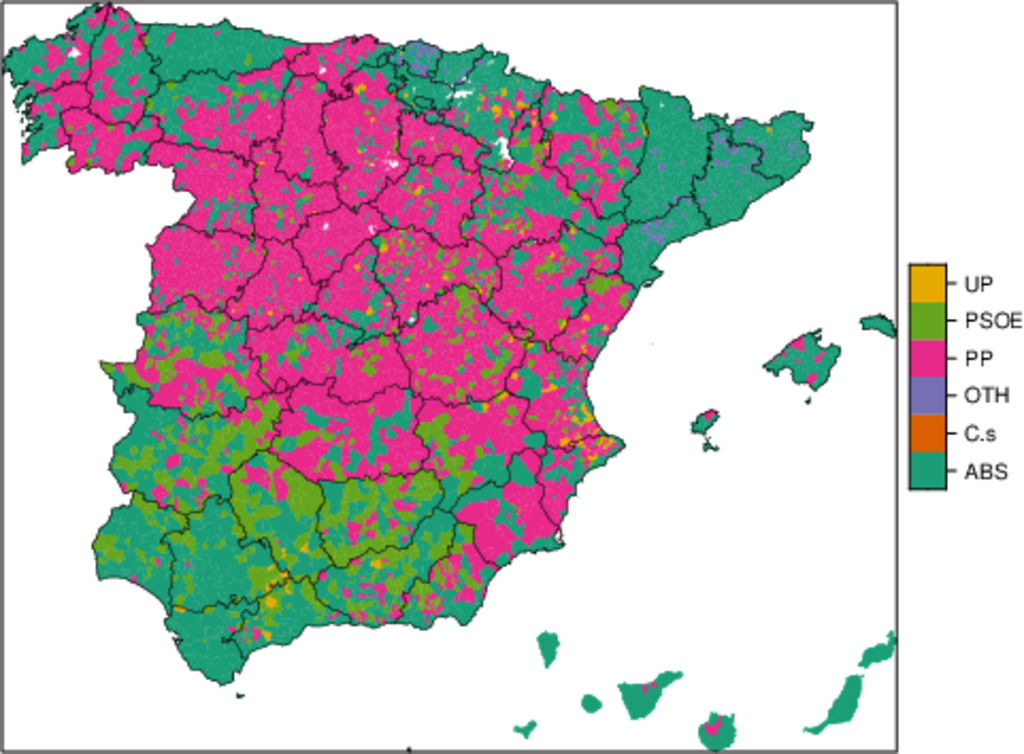 ################################################################## ## Initial configuration ################################################################## ## Clone or download the repository and set the working directory ## with setwd to the folder where the repository is located. library("lattice") library("ggplot2") ## latticeExtra must be loaded after ggplot2 to prevent masking of its ## `layer` function. library("latticeExtra") library("RColorBrewer") source("configLattice.R") ################################################################## library("sp") library("sf") ################################################################## ## Read data ################################################################## sfMapVotes <- st_read("data/Spatial/sfMapVotes.shp") sfMapVotes$whichMax <- factor(sfMapVotes$whichMax) sfMapVotes$PROV <- factor(sfMapVotes$PROV) summary(sfMapVotes) ################################################################## ## Province Boundaries ################################################################## sfProvs <- st_read("data/Spatial/spain_provinces.shp", crs = 25830) ################################################################## ## Quantitative variable ################################################################## ## Number of intervals (colors) N <- 6 ## Sequential palette quantPal <- brewer.pal(n = N, "Oranges") ggplot(sfMapVotes) + ## Display the pcMax variable... geom_sf(aes(fill = pcMax), ## without drawing municipality boundaries color = "transparent") + scale_fill_gradientn(colours = quantPal) + ## And overlay provinces boundaries geom_sf(data = sfProvs, fill = 'transparent', ## but do not include them in the legend show.legend = FALSE) + theme_bw() spMapVotes <- as(sfMapVotes, "Spatial") spProvs <- as(sfProvs, "Spatial") ## Number of cuts ucN <- 1000 ## Palette created with interpolation ucQuantPal <- colorRampPalette(quantPal)(ucN) ## Province boundaries provinceLines <- list("sp.polygons", spProvs, lwd = 0.1, # draw the lines after the data first = FALSE) ## Main plot spplot(spMapVotes["pcMax"], col.regions = ucQuantPal, cuts = ucN, ## Do not draw municipality boundaries col = "transparent", ## Overlay province boundaries sp.layout = provinceLines) ################################################################## ## Data classification ################################################################## ggplot(as.data.frame(spMapVotes), aes(pcMax, fill = whichMax, colour = whichMax)) + geom_density(alpha = 0.1) + theme_bw() library("classInt") ## Compute intervals with the same number of elements intQuant <- classIntervals(sfMapVotes$pcMax, n = N, style = "quantile") ## Compute intervals with the natural breaks algorithm intFisher <- classIntervals(sfMapVotes$pcMax, n = N, style = "fisher") plot(intQuant, pal = quantPal, main = "") plot(intFisher, pal = quantPal, main = "") ## spplot solution ## Add a new categorical variable with cut, using the computed breaks spMapVotes$pcMaxInt <- cut(spMapVotes$pcMax, breaks = intFisher$brks, include.lowest = TRUE) spplot(spMapVotes["pcMaxInt"], col = "transparent", col.regions = quantPal, sp.layout = provinceLines) ## sf and geom_sf sfMapVotes$pcMaxInt <- cut(sfMapVotes$pcMax, breaks = intFisher$brks, include.lowest = TRUE) ggplot(sfMapVotes) + geom_sf(aes(fill = pcMaxInt), color = "transparent") + scale_fill_brewer(palette = "Oranges") + geom_sf(data = sfProvs, fill = "transparent", show.legend = FALSE) + theme_bw() ################################################################## ## Qualitative variable ################################################################## classes <- levels(spMapVotes$whichMax) nClasses <- length(classes) qualPal <- brewer.pal(nClasses, "Dark2") ## spplot solution spplot(spMapVotes["whichMax"], col.regions = qualPal, col = 'transparent', sp.layout = provinceLines) ## geom_sf solution ggplot(sfMapVotes) + geom_sf(aes(fill = whichMax), color = "transparent") + scale_fill_brewer(palette = "Dark2") + geom_sf(data = sfProvs, fill = "transparent", show.legend = FALSE) + theme_bw() ################################################################## ## Small multiples ################################################################## ggplot(sfMapVotes) + geom_sf(aes(fill = pcMaxInt), color = "transparent") + ## Define the faceting using two rows facet_wrap(~whichMax, nrow = 2) + scale_fill_brewer(palette = "Oranges") + geom_sf(data = sfProvs, fill = "transparent", size = 0.1, show.legend = FALSE) + theme_bw() ################################################################## ## Bivariate map ################################################################## ## PP and Cs -> Right ## PSOE and UP -> Left levels(sfMapVotes$whichMax) <- c("ABS", "Right", "OTH", "Right", "Left", "Left") ## Number of steps. Nint <- 4 ## ABS - Greys, Right - Blues, OTH - Greens, Left - Reds multiPal <- lapply(c("Greys", "Blues", "Greens", "Reds"), function(pal) brewer.pal(Nint, pal)) multiPal <- do.call(rbind, multiPal) library("biscale") sfClass <- bi_class(sfMapVotes, x = whichMax, y = pcMax, style = "fisher", dim = 4) bipal <- c(multiPal) nms <- outer(1:4, 1:4, paste, sep = "-") names(bipal) <- c(nms) bilegend <- bi_legend(pal = bipal, dim = 4, xlab = "ABS-Right-OTH-Left", ylab = "% of votes ", size = 8) bimap <- ggplot() + geom_sf(data = sfClass, aes(fill = bi_class), color = "white", size = 0.1, show.legend = FALSE) + bi_scale_fill(pal = bipal, dim = 4) + bi_theme() library("cowplot") ggdraw() + draw_plot(bimap, 0, 0, 1, 1) + draw_plot(bilegend, 0.05, 0.1, width = 0.2, height = 0.2) ## Define the intervals intFisher <- classIntervals(spMapVotes$pcMax, n = Nint, style = "fisher") ## ... and create a categorical variable with them spMapVotes$pcMaxInt <- cut(spMapVotes$pcMax, breaks = intFisher$brks) levels(spMapVotes$whichMax) <- c("ABS", "Right", "OTH", "Right", "Left", "Left") classes <- levels(spMapVotes$whichMax) nClasses <- length(classes) pList <- lapply(1:nClasses, function(i) { ## O