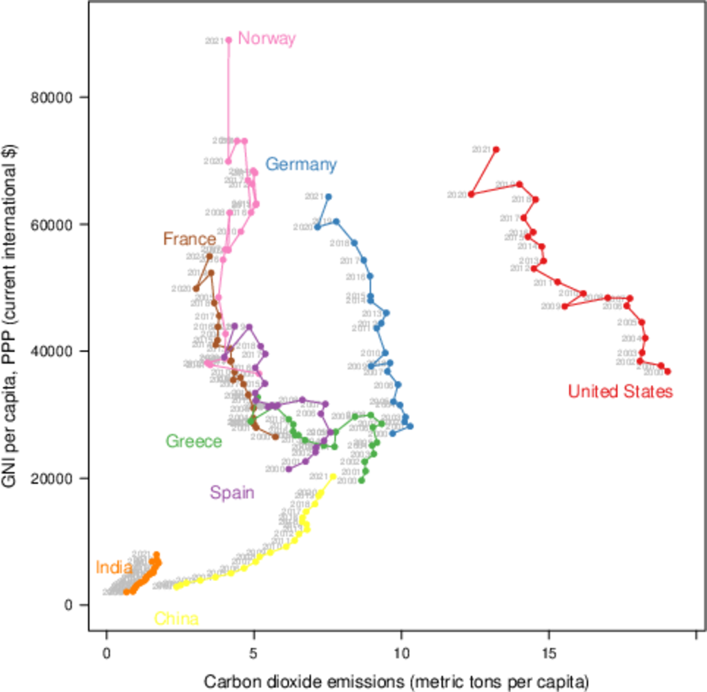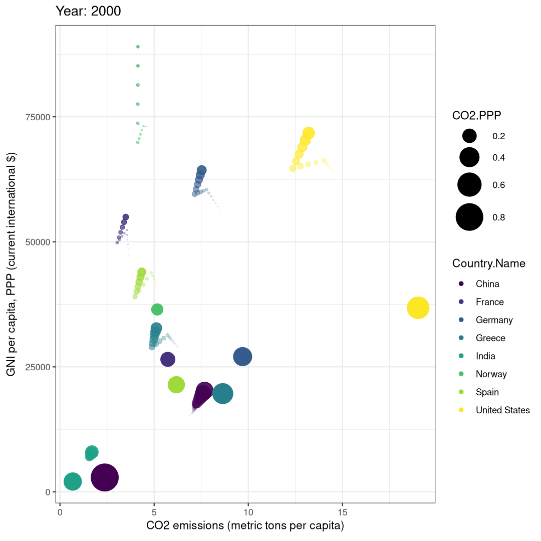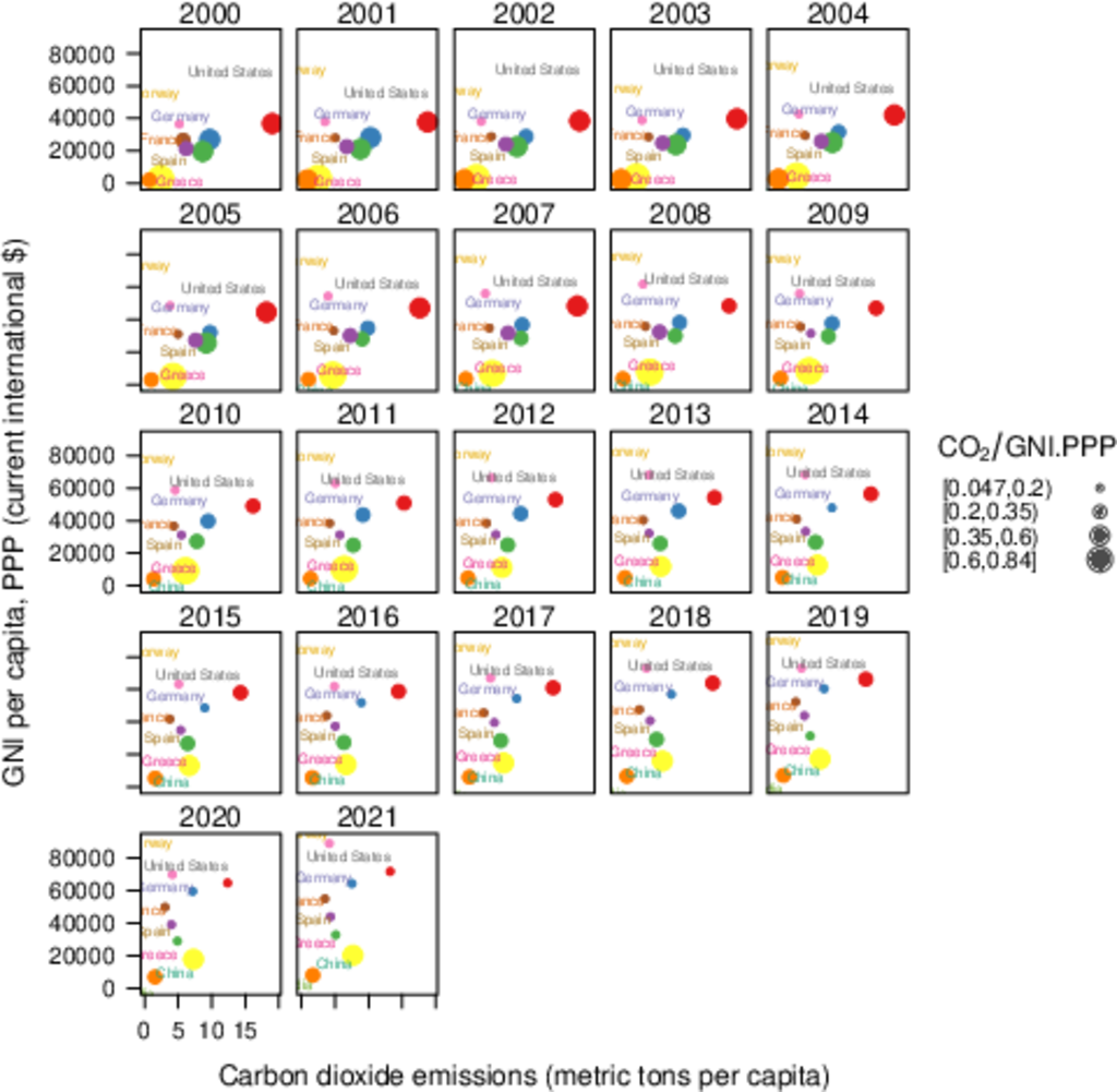 ################################################################## ## Initial configuration ################################################################## ## Clone or download the repository and set the working directory ## with setwd to the folder where the repository is located. library("lattice") library("ggplot2") ## latticeExtra must be loaded after ggplot2 to prevent masking of its ## `layer` function. library("latticeExtra") library("RColorBrewer") source('configLattice.R') ################################################################## ################################################################## ## Polylines ################################################################## library("zoo") load('data/TimeSeries/CO2.RData') ## lattice version xyplot(GNI.capita ~ CO2.capita, data = CO2data, xlab = "Carbon dioxide emissions (metric tons per capita)", ylab = "GNI per capita, PPP (current international $)", groups = Country.Name, type = 'b') ## ggplot2 version ggplot(data = CO2data, aes(x = CO2.capita, y = GNI.capita, color = Country.Name)) + xlab("Carbon dioxide emissions (metric tons per capita)") + ylab("GNI per capita, PPP (current international $)") + geom_point() + geom_path() + theme_bw() ################################################################## ## Choosing colors ################################################################## nCountries <- nlevels(CO2data$Country.Name) pal <- brewer.pal(n = nCountries, 'Set1') ## Rank of average values of CO2 per capita CO2mean <- aggregate(CO2.capita ~ Country.Name, data = CO2data, FUN = mean) palOrdered <- pal[rank(CO2mean$CO2.capita)] library("reshape2") CO2capita <- CO2data[, c('Country.Name', 'Year', 'CO2.capita')] CO2capita <- dcast(CO2capita, Country.Name ~ Year) summary(CO2capita) hCO2 <- hclust(dist(CO2capita[, -1])) oldpar <- par(mar = c(0, 2, 0, 0) + .1) plot(hCO2, labels = CO2capita$Country.Name, xlab = '', ylab = '', sub = '', main = '') par(oldpar) idx <- match(levels(CO2data$Country.Name), CO2capita$Country.Name[hCO2$order]) palOrdered <- pal[idx] ## simpleTheme encapsulates the palette in a new theme for xyplot myTheme <- simpleTheme(pch = 19, cex = 0.6, col = palOrdered) ## lattice version pCO2.capita <- xyplot(GNI.capita ~ CO2.capita, data = CO2data, xlab = "Carbon dioxide emissions (metric tons per capita)", ylab = "GNI per capita, PPP (current international $)", groups = Country.Name, par.settings = myTheme, type = 'b') ## ggplot2 version gCO2.capita <- ggplot(data = CO2data, aes(x = CO2.capita, y = GNI.capita, color = Country.Name)) + geom_point() + geom_path() + scale_color_manual(values = palOrdered, guide = "none") + xlab('CO2 emissions (metric tons per capita)') + ylab('GNI per capita, PPP (current international $)') + theme_bw() ################################################################## ## Labels to show time information ################################################################## xyplot(GNI.capita ~ CO2.capita, data = CO2data, xlab = "Carbon dioxide emissions (metric tons per capita)", ylab = "GNI per capita, PPP (current international $)", groups = Country.Name, par.settings = myTheme, type = 'b', panel = function(x, y, ..., subscripts, groups){ panel.text(x, y, ..., labels = CO2data$Year[subscripts], pos = 2, cex = 0.5, col = 'gray') panel.superpose(x, y, subscripts, groups,...) }) ## lattice version pCO2.capita <- pCO2.capita + glayer_(panel.text(..., labels = CO2data$Year[subscripts], pos = 2, cex = 0.5, col = 'gray')) ## ggplot2 version gCO2.capita <- gCO2.capita + geom_text(aes(label = Year), colour = 'gray', size = 2.5, hjust = 0, vjust = 0) ################################################################## ## Country names: positioning labels ################################################################## library("directlabels") ## lattice version direct.label(pCO2.capita, method = 'extreme.grid') ## ggplot2 version direct.label(gCO2.capita, method = 'extreme.grid') ################################################################## ## A panel for each year ################################################################## ## lattice version xyplot(GNI.capita ~ CO2.capita | factor(Year), data = CO2data, xlab = "Carbon dioxide emissions (metric tons per capita)", ylab = "GNI per capita, PPP (current international $)", groups = Country.Name, type = 'p', auto.key = list(space = 'right')) ## ggplot2 version ggplot(data = CO2data, aes(x = CO2.capita, y = GNI.capita, colour = Country.Name)) + facet_wrap(~ Year) + geom_point(pch = 19) + xlab('CO2 emissions (metric tons per capita)') + ylab('GNI per capita, PPP (current international $)') + theme_bw() ## lattice version pl <- xyplot(GNI.capita ~ CO2.capita | factor(Year), data = CO2data, xlab = "Carbon dioxide emissions (metric tons per capita)", ylab = "GNI per capita, PPP (current international $)", groups = Country.Name, type = 'b', par.settings = myTheme) ## Extracted from the qp.labels help page dlmethod <- list("first.points", cex = 0.5, "calc.boxes", "enlarge.box", qp.labels("y","bottom","top")) direct.label(pl, dlmethod) ## ggplot2 version pg <- ggplot(data = CO2data, aes(x = CO2.capita, y = GNI.capita, colour = Country.Name)) + facet_wrap(~ Year) + geom_point(pch = 19) + scale_color_manual(values = palOrdered, guide = "none") + xlab('CO2 emissions (metric tons per capita)') + ylab('GNI per capita, PPP (current international $)') + theme_bw() direct.label(pg, dlmethod) ################################################################## ## Using variable size to encode an additional variable ################################################################## library("classInt") CO2data$CO2.PPP <- with(CO2data, CO2/GNI.PPP * 1e9) intervals <- classIntervals(CO2data$CO2.PPP, n = 4, style = 'fisher') nInt <- length(intervals$brks) - 1 cex.key <- seq(0.5, 1.8, length = nInt) idx <- findCols(intervals) CO2data$cexPoints <- cex.key[idx] ggplot(data = CO2data, aes(x = CO2.capita, y = GNI.capita, colour = Country.Name)) + facet_wr