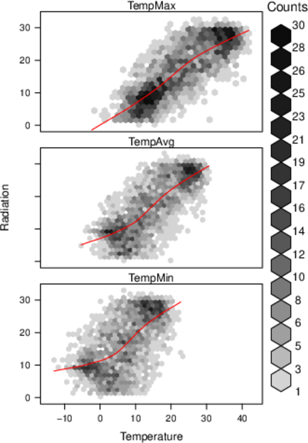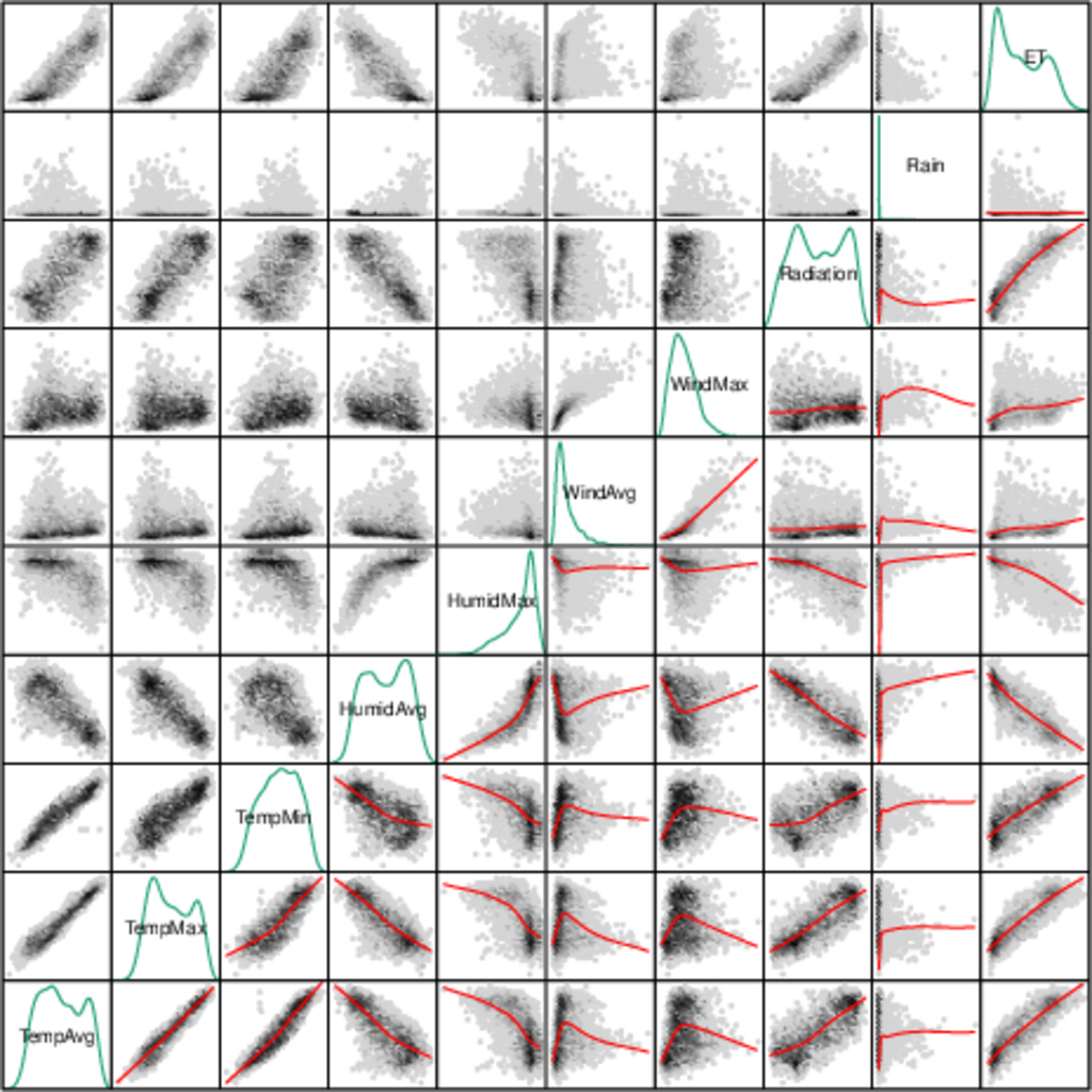 ################################################################## ## Initial configuration ################################################################## ## Clone or download the repository and set the working directory ## with setwd to the folder where the repository is located. library("lattice") library("ggplot2") ## latticeExtra must be loaded after ggplot2 to prevent masking of its ## `layer` function. library("latticeExtra") library("RColorBrewer") source('configLattice.R') ################################################################## ################################################################## ## Scatterplot matrix: time as a grouping variable ################################################################## library("zoo") load('data/TimeSeries/aranjuez.RData') aranjuezDF <- as.data.frame(aranjuez) aranjuezDF$Month <- format(index(aranjuez), '%m') ## Red-Blue palette with black added (12 colors) colors <- c(brewer.pal(n = 11, 'RdBu'), '#000000') ## Rearrange according to months (darkest for summer) colors <- colors[c(6:1, 12:7)] splom(~ aranjuezDF[1:10], groups = aranjuezDF$Month, auto.key = list(space = 'right', title = 'Month', cex.title = 1), pscale = 0, varname.cex = 0.7, xlab = '', par.settings = custom.theme(symbol = colors, pch = 19), cex = 0.3, alpha = 0.1) trellis.focus('panel', 1, 1) idx <- panel.link.splom(pch = 13, cex = 0.6, col = 'green') aranjuez[idx,] library("GGally") ggpairs(aranjuezDF, columns = 1:10, ## Do not include "Month" upper = list(continuous = wrap("points", alpha = 0.7)), lower = list(continuous = wrap("points", alpha = 0.7)), diag = list(continuous = wrap("densityDiag", alpha = 0.7)), mapping = aes(colour = Month), legend = 1) + scale_fill_manual(values = colors) + scale_colour_manual(values = colors) + theme(axis.text = element_text(size = 6), axis.text.x = element_text(angle = 45), strip.text = element_text(size = 7)) ################################################################## ## Hexagonal binning ################################################################## library("hexbin") splom(~as.data.frame(aranjuez), panel = panel.hexbinplot, diag.panel = function(x, ...){ yrng <- current.panel.limits()$ylim d <- density(x, na.rm = TRUE) d$y <- with(d, yrng[1] + 0.95 * diff(yrng) * y / max(y)) panel.lines(d) diag.panel.splom(x, ...) }, lower.panel = function(x, y, ...){ panel.hexbinplot(x, y, ...) panel.loess(x, y, ..., col = 'red') }, xlab = '', pscale = 0, varname.cex = 0.7) library("reshape2") aranjuezRshp <- melt(aranjuezDF, measure.vars = c('TempMax', 'TempAvg', 'TempMin'), variable.name = 'Statistic', value.name = 'Temperature') summary(aranjuezRshp) hexbinplot(Radiation ~ Temperature | Statistic, data = aranjuezRshp, layout = c(1, 3)) + layer(panel.loess(..., col = 'red')) ggplot(data = aranjuezRshp, aes(Temperature, Radiation)) + geom_hex() + stat_smooth(se = FALSE, method = 'loess', col = 'red') + facet_wrap(~ Statistic, ncol = 1) + theme_bw() ################################################################## ## Scatterplot with time as a conditioning variable ################################################################## ggplot(data = aranjuezRshp, aes(Radiation, Temperature)) + facet_grid(Statistic ~ Month) + geom_point(col = 'skyblue4', pch = 19, cex = 0.5, alpha = 0.3) + geom_rug() + stat_smooth(se = FALSE, method = 'loess', col = 'indianred1', lwd = 1.2) + theme_bw() + theme(axis.text.x = element_text(size = 7, angle = 45)) useOuterStrips( xyplot(Temperature ~ Radiation | Month * Statistic, data = aranjuezRshp, between = list(x = 0), col = 'skyblue4', pch = 19, cex = 0.5, alpha = 0.3)) + layer({ panel.rug(..., col.line = 'indianred1', end = 0.05, alpha = 0.6) panel.loess(..., col = 'indianred1', lwd = 1.5, alpha = 1) })