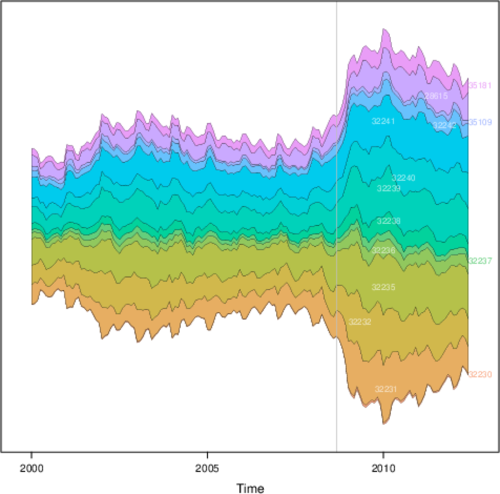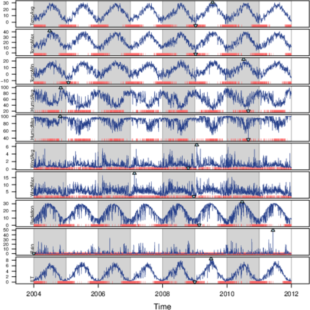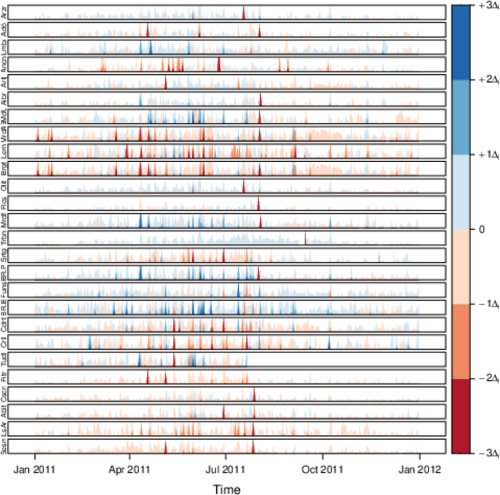################################################################## ## Initial configuration ################################################################## ## Clone or download the repository and set the working directory ## with setwd to the folder where the repository is located. library("lattice") library("ggplot2") ## latticeExtra must be loaded after ggplot2 to prevent masking of its ## `layer` function. library("latticeExtra") library("RColorBrewer") source('configLattice.R') ################################################################## ################################################################## ## Time graph of variables with different scales ################################################################## library("zoo") load('data/TimeSeries/aranjuez.RData') ## The layout argument arranges panels in rows xyplot(aranjuez, layout = c(1, ncol(aranjuez))) autoplot(aranjuez) + facet_free() ################################################################## ## Annotations to enhance the time graph ################################################################## ## lattice version ## Auxiliary function to extract the year value of a POSIXct time ## index Year <- function(x)format(x, "%Y") xyplot(aranjuez, layout = c(1, ncol(aranjuez)), strip = FALSE, scales = list(y = list(cex = 0.6, rot = 0)), panel = function(x, y, ...){ ## Alternation of years panel.xblocks(x, Year, col = c("lightgray", "white"), border = "darkgray") ## Values under the average highlighted with red regions panel.xblocks(x, y < mean(y, na.rm = TRUE), col = "indianred1", height = unit(0.1, 'npc')) ## Time series panel.lines(x, y, col = 'royalblue4', lwd = 0.5, ...) ## Label of each time series panel.text(x[1], min(y, na.rm = TRUE), names(aranjuez)[panel.number()], cex = 0.6, adj = c(0, 0), srt = 90, ...) ## Triangles to point the maxima and minima idxMax <- which.max(y) panel.points(x[idxMax], y[idxMax], col = 'black', fill = 'lightblue', pch = 24) idxMin <- which.min(y) panel.points(x[idxMin], y[idxMin], col = 'black', fill = 'lightblue', pch = 25) }) ## ggplot2 version timeIdx <- index(aranjuez) aranjuezLong <- fortify(aranjuez, melt = TRUE) summary(aranjuezLong) ## Values below mean are negative after being centered scaled <- fortify(scale(aranjuez, scale = FALSE), melt = TRUE) ## The 'scaled' column is the result of the centering. ## The new 'Value' column store the original values. scaled <- transform(scaled, scaled = Value, Value = aranjuezLong$Value) underIdx <- which(scaled$scaled <= 0) ## 'under' is the subset of values below the average under <- scaled[underIdx,] library("xts") ep <- endpoints(timeIdx, on = 'years') ep <- ep[-1] N <- length(ep) ## 'tsp' is start and 'tep' is the end of each band. One of each two ## years are selected. tep <- timeIdx[ep[seq(1, N, 2)] + 1] tsp <- timeIdx[ep[seq(2, N, 2)]] minIdx <- timeIdx[apply(aranjuez, 2, which.min)] minVals <- apply(aranjuez, 2, min, na.rm = TRUE) mins <- data.frame(Index = minIdx, Value = minVals, Series = names(aranjuez)) maxIdx <- timeIdx[apply(aranjuez, 2, which.max)] maxVals <- apply(aranjuez, 2, max, na.rm = TRUE) maxs <- data.frame(Index = maxIdx, Value = maxVals, Series = names(aranjuez)) ggplot(data = aranjuezLong, aes(Index, Value)) + ## Time series of each variable geom_line(colour = "royalblue4", lwd = 0.5) + ## Year bands annotate('rect', xmin = tsp, xmax = tep, ymin = -Inf, ymax = Inf, alpha = 0.4) + ## Values below average geom_rug(data = under, sides = 'b', col = 'indianred1') + ## Minima geom_point(data = mins, pch = 25) + ## Maxima geom_point(data = maxs, pch = 24) + ## Axis labels and theme definition labs(x = 'Time', y = NULL) + theme_bw() + ## Each series is displayed in a different panel with an ## independent y scale facet_free() ################################################################## ## Time series of variables with the same scale ################################################################## load('data/TimeSeries/navarra.RData') avRad <- zoo(rowMeans(navarra, na.rm = 1), index(navarra)) pNavarra <- xyplot(navarra - avRad, superpose = TRUE, auto.key = FALSE, lwd = 0.5, alpha = 0.3, col = 'midnightblue') pNavarra ################################################################## ## Aspect ratio and rate of change ################################################################## xyplot(navarra - avRad, aspect = 'xy', cut = list(n = 3, overlap = 0.1), strip = FALSE, superpose = TRUE, auto.key = FALSE, lwd = 0.5, alpha = 0.3, col = 'midnightblue') ################################################################## ## The horizon graph ################################################################## horizonplot(navarra - avRad, layout = c(1, ncol(navarra)), origin = 0, ## Deviations in each panel are calculated ## from this value colorkey = TRUE, col.regions = brewer.pal(6, "RdBu")) ################################################################## ## Time graph of the differences between a time series and a reference ################################################################## Ta <- aranjuez$TempAvg timeIndex <- index(aranjuez) longTa <- ave(Ta, format(timeIndex, '%j')) diffTa <- (Ta - longTa) xyplot(cbind(Ta, longTa, diffTa), col = c('darkgray', 'red', 'midnightblue'), superpose = TRUE, auto.key = list(space = 'right'), screens = c(rep('Average Temperature', 2), 'Differences')) years <- unique(format(timeIndex, '%Y')) horizonplot(diffTa, cut = list(n = 8, overlap = 0), colorkey = TRUE, col.regions = brewer.pal(6, "RdBu"), layout = c(1, 8), scales = list(draw = FALSE, y = list(relation = 'same')), origin = 0, strip.left = FALSE) + layer(grid.text(years[panel.number()], x = 0, y = 0.1, gp = gpar(cex = 0.8), just = "left")) year <- function(x)as.numeric(format(x, '%Y')) day <- function(x)as.numeric(format(x, '%d')) month <- function(x)as.numeric(format(x, '%m')) myTheme <- modifyList(custom.theme(region = brewer.pal(9, 'RdBu')), list( strip.background = list(col = 'gray'), panel.background = list(co